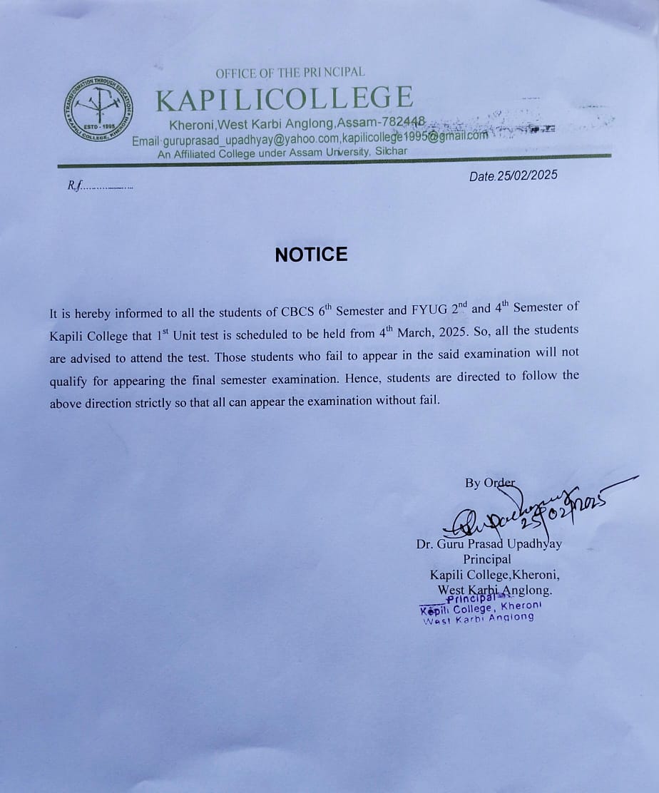 Kapili College, Kheroni, West Karbi Anglong was established in the year 1995. It has been imparting higher education (FYUGP) Arts to the students of rural backward and Hills area. The College is running under Assam University, Silchar (A Central University constituted by an Act of Parliament in 1994). It was granted permission and affiliation by Assam University, Silchar Vide its letter No.AUD/C-51/97/053 dated 31-05-1997..